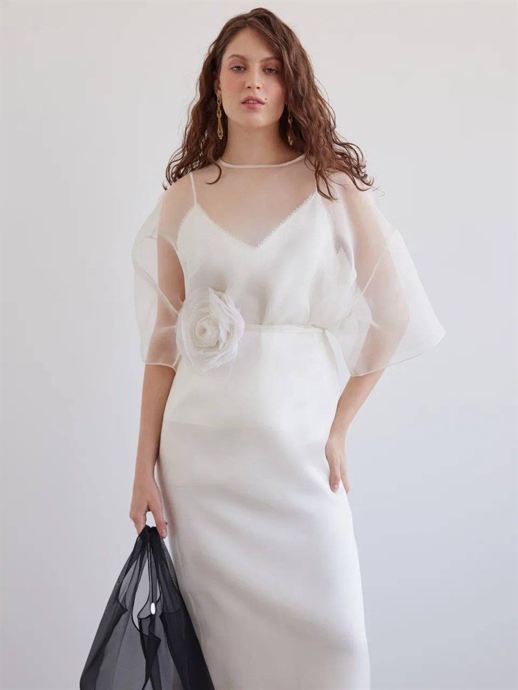 БЛУЗКА из органзы, минималистичная, с коротким рукавом, с круглым вырезом, оверсайз (IVORY)