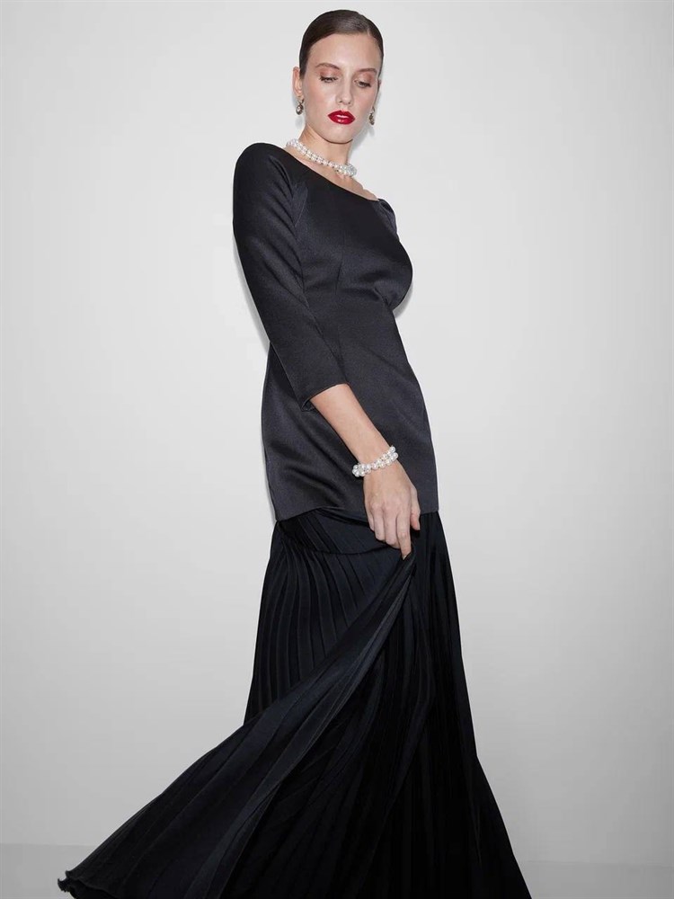 БЛУЗКА "Меган" силуэтная, удлиненная, приталенная, с открытыми плечами (из дабл-дюшеса, ЧЕРНАЯ)