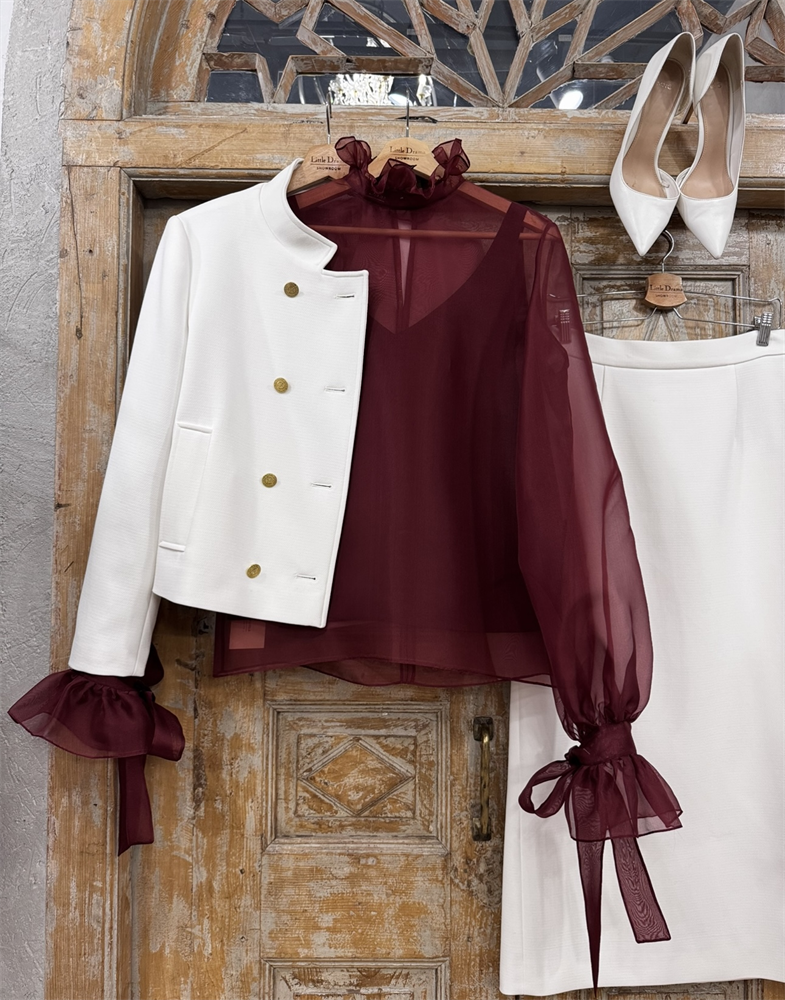 БЛУЗКА (ОРГАНЗА, пышные рукава, воротник-стойка с рюшами, БОРДО)