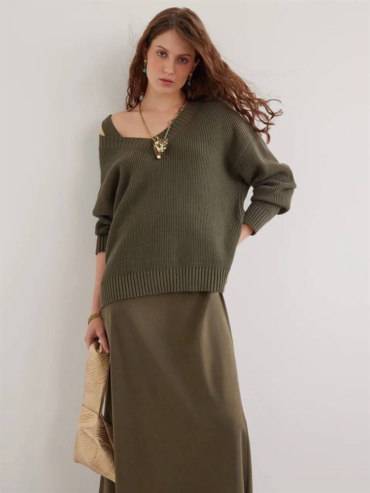 ДЖЕМПЕР двусторонний (V-образный и круглый вырез) из хлопка, ХАКИ/ЛЕСНОЙ ЗЕЛЕНЫЙ