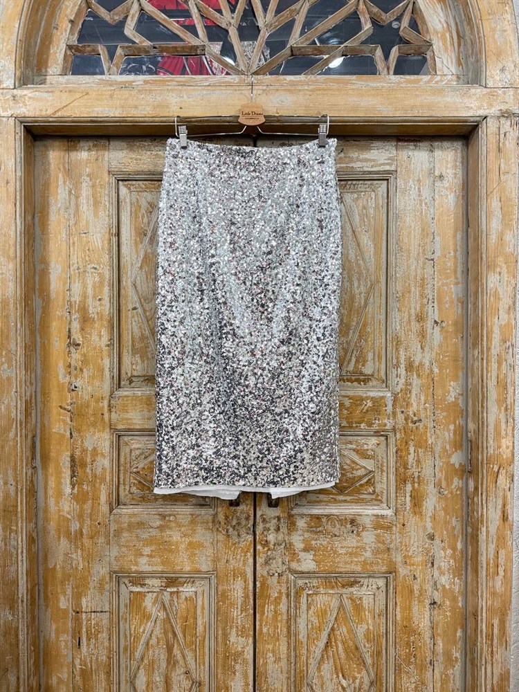 ЮБКА-КАРАНДАШ из пайеток, с разрезом сзади (длина 77 см), СЕРЕБРО