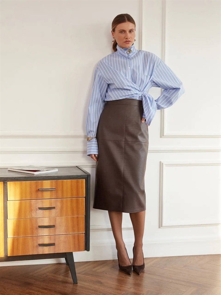 ЮБКА-карандаш, зауженная, высокая шлица, отстрочка крестом, D-73 (из ЭКО-кожи "КРОКОДИЛ"), ШОКОЛАДНЫЙ
