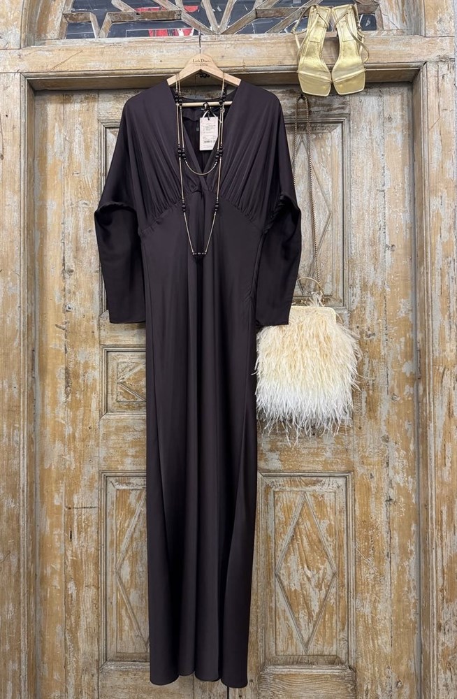ПЛАТЬЕ (D-100) с драпировкой, подрезом на запАхе, цельнокроенными рукавами и двойной юбкой по косой (из премиум-атласа), ШОКОЛАД