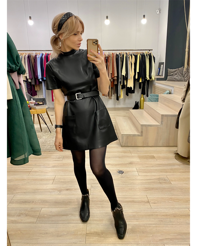 ПЛАТЬЕ МИНИ с юбкой-трапецией, высокой талией, с 2 карманами (из ЭКО-кожи на замше)