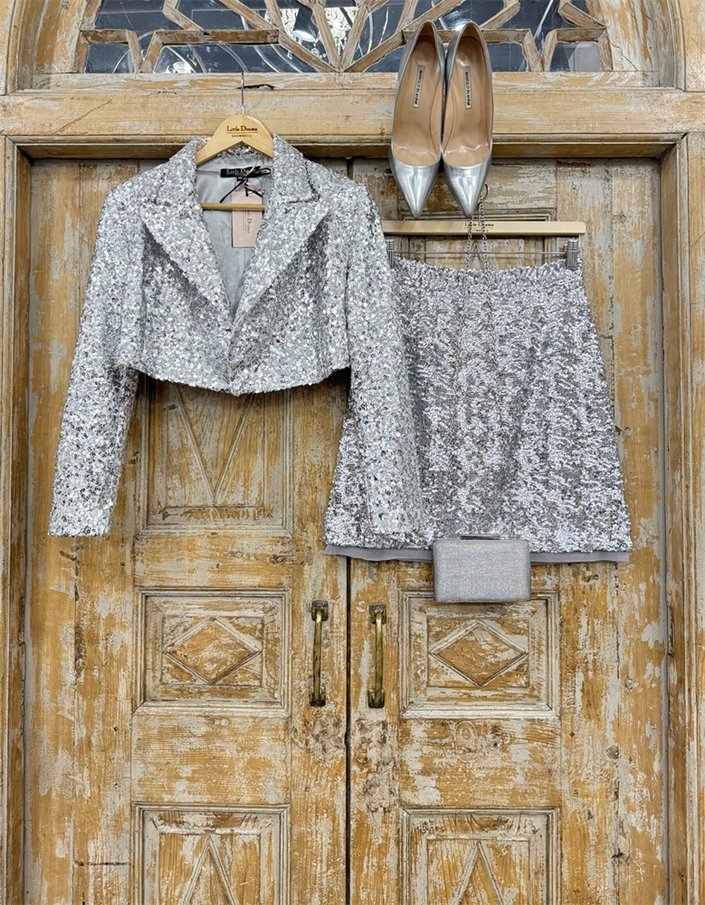 ЖАКЕТ-БОЛЕРО с острыми лацканами, двубортный, приталенный (из серебристых пайеток)